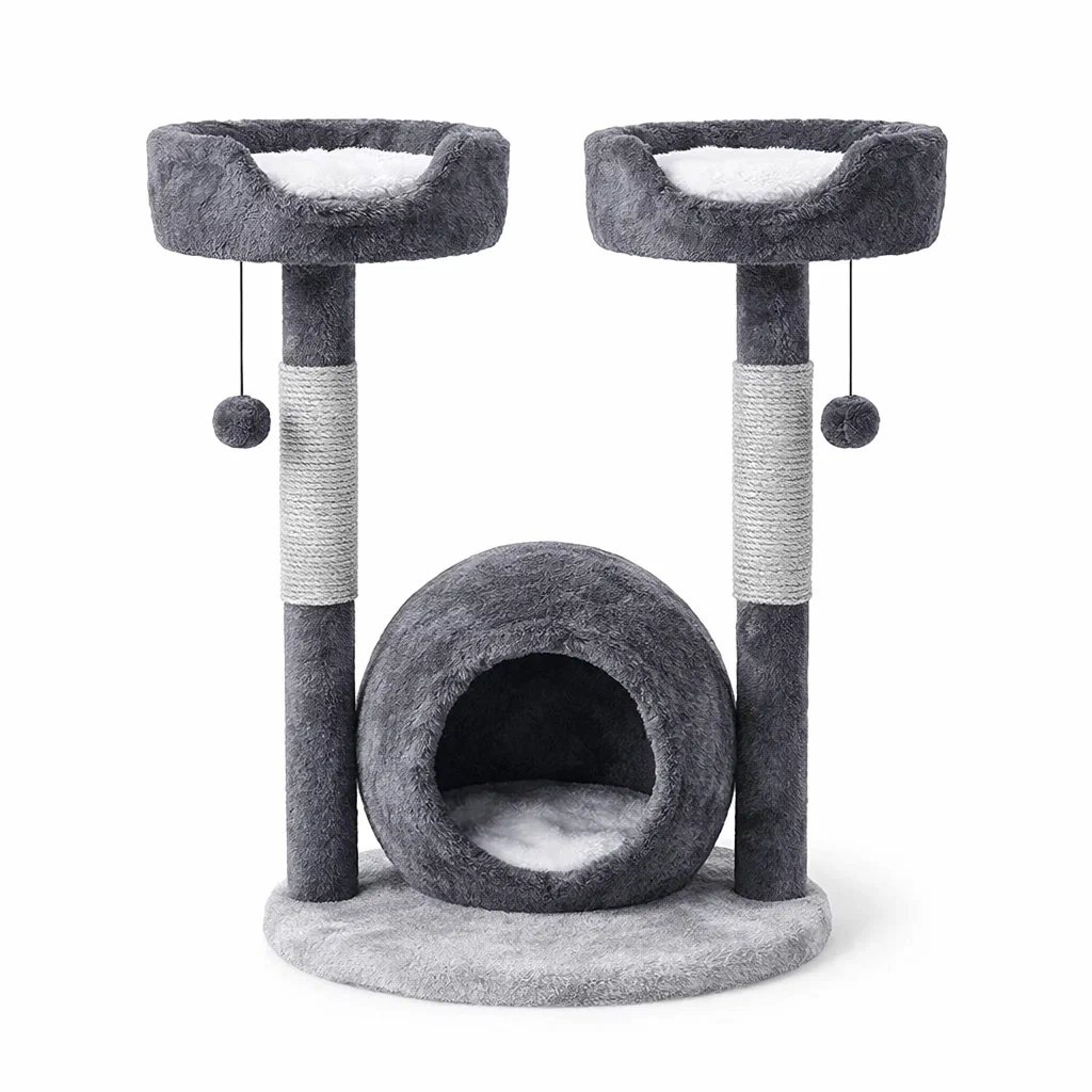 Questo albero graffiatoio per gatti è rivestito in peluche morbido e dotato di corde in sisal sulle colonne. Comprende due aree di riposo in alto e una cuccia spaziosa in basso. Ogni colonna è avvolta in corda sisal per permettere al gatto di graffiare liberamente. Include palline pendenti per intrattenimento aggiuntivo.